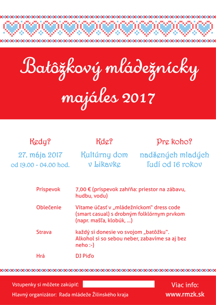 Rada mládeže Žilinského kraja pozýva na Batôžkový mládežnícky majáles 2017, ktorý sa uskutoční 27. mája 2017 v Kultúrnom dome v Likavke pri Ružomberku. Začiatok o 19:00 hod.